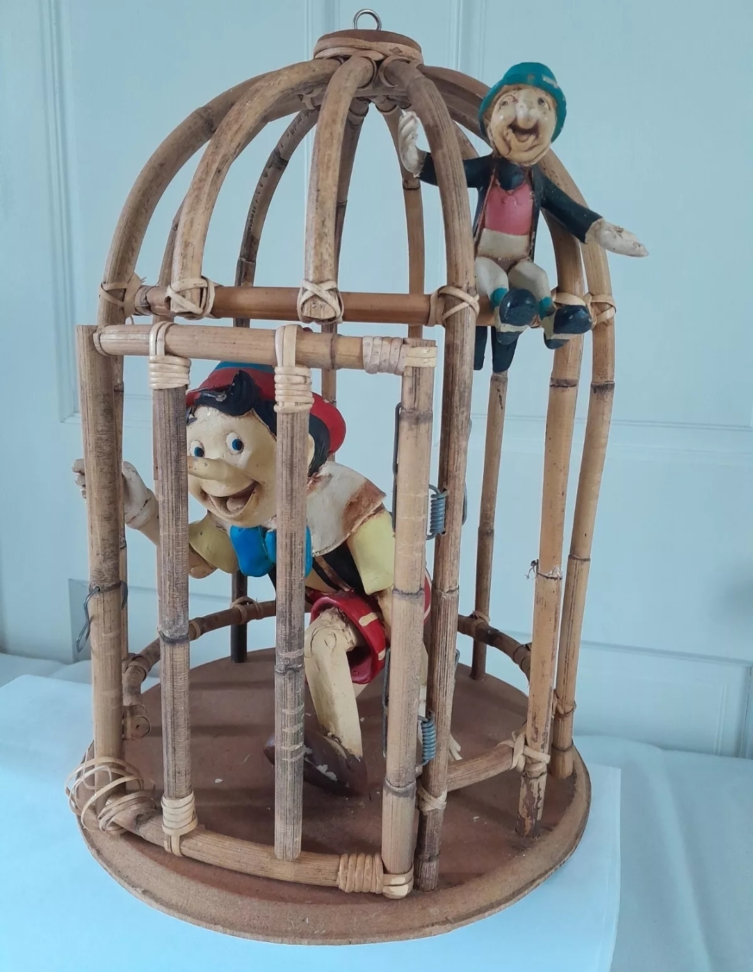 Lot 375: Walt Disney Pinocchio and Jiminy Cricket in Bamboo Cage Opens/Hangs Unique Note Bamboo wrapping on door