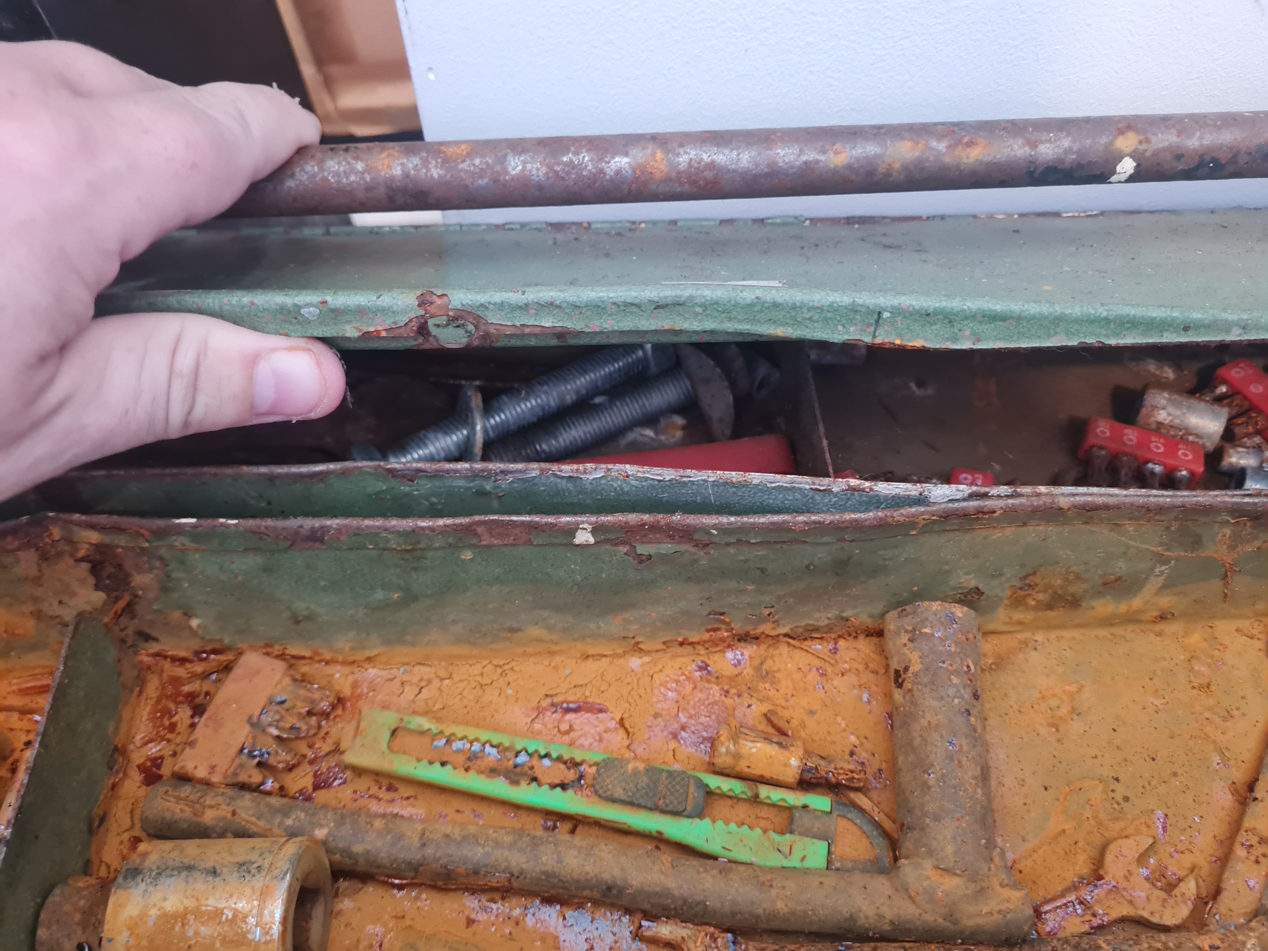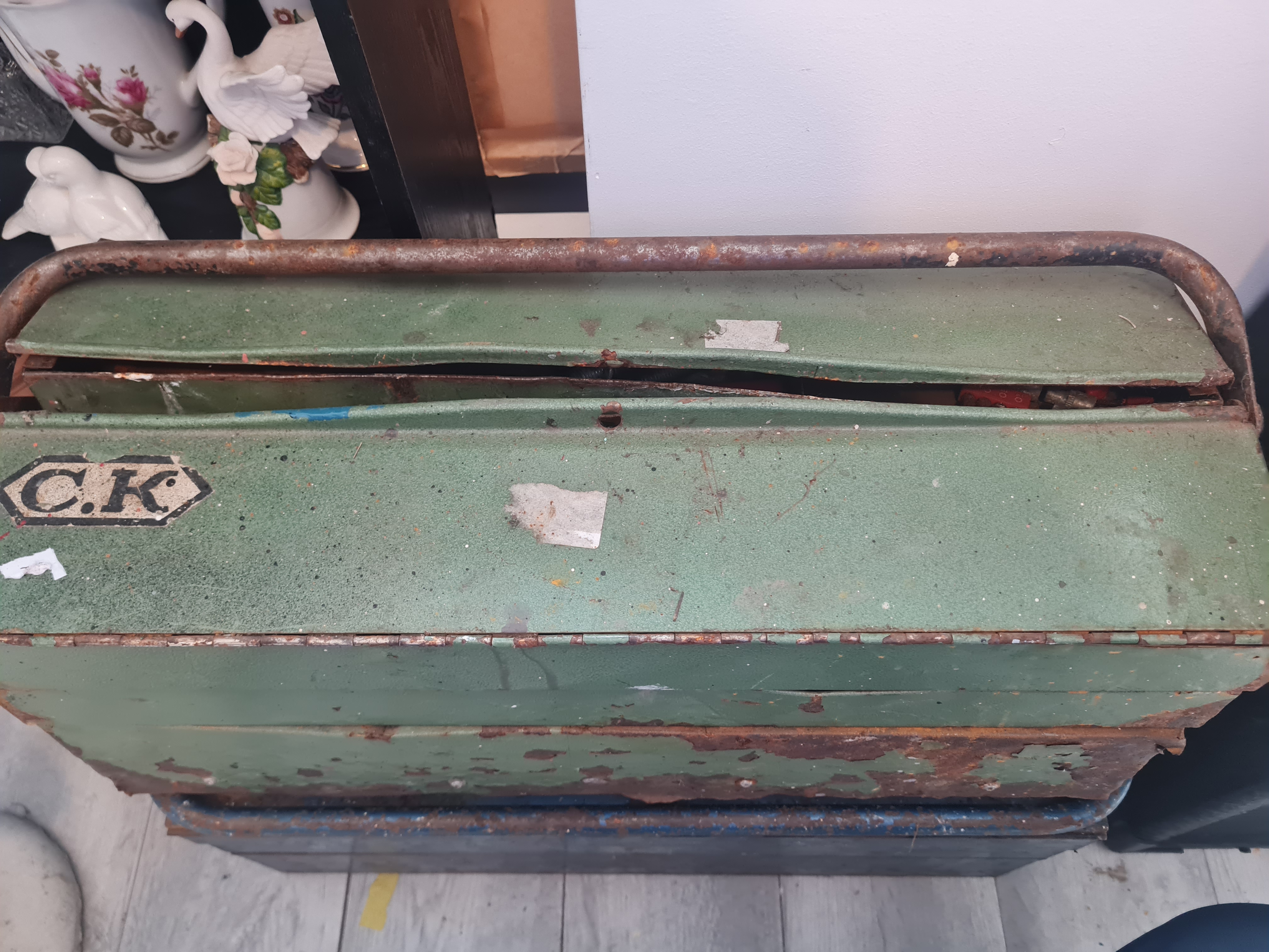 Vintage green metal tool box with contents