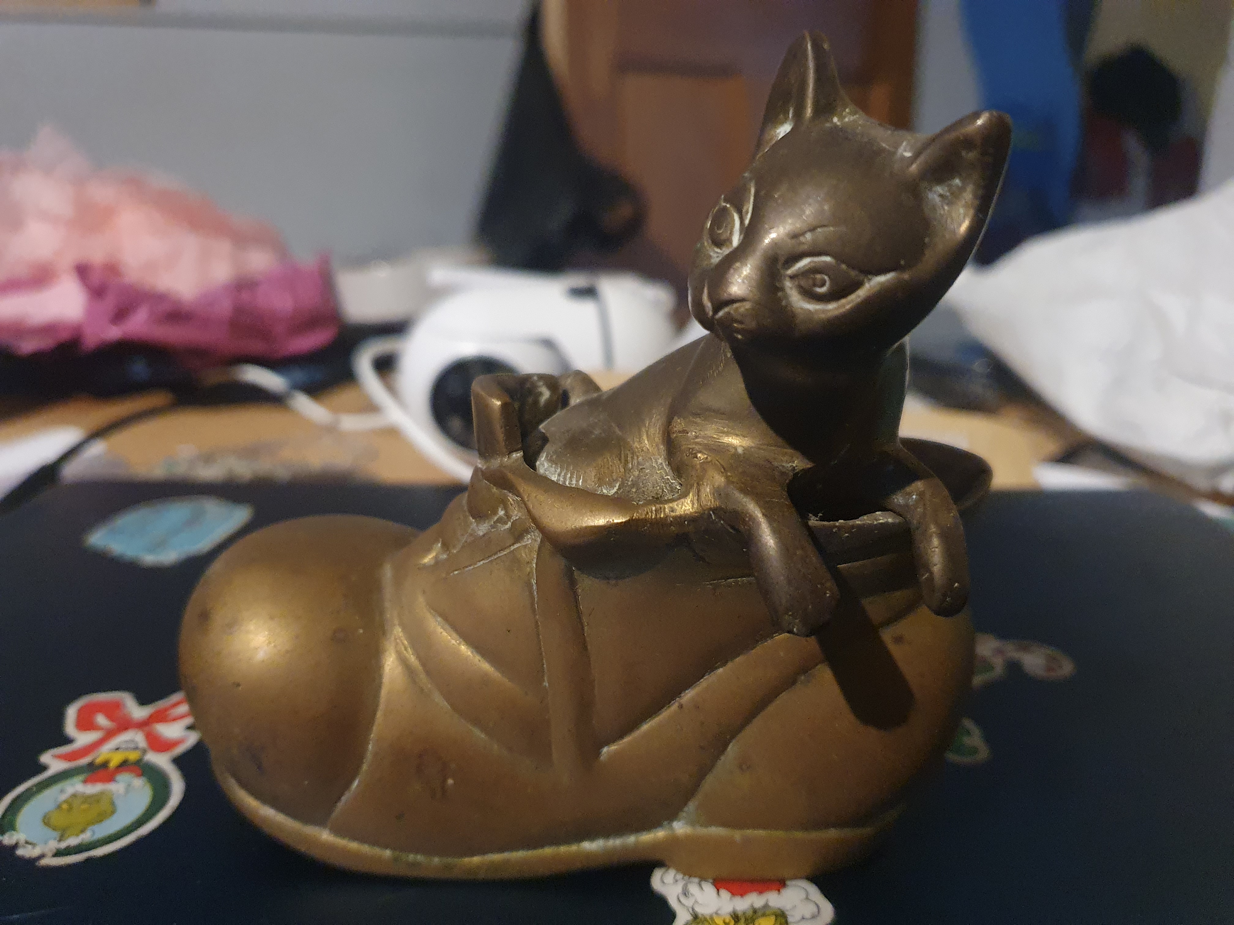 Large brass cat in boot