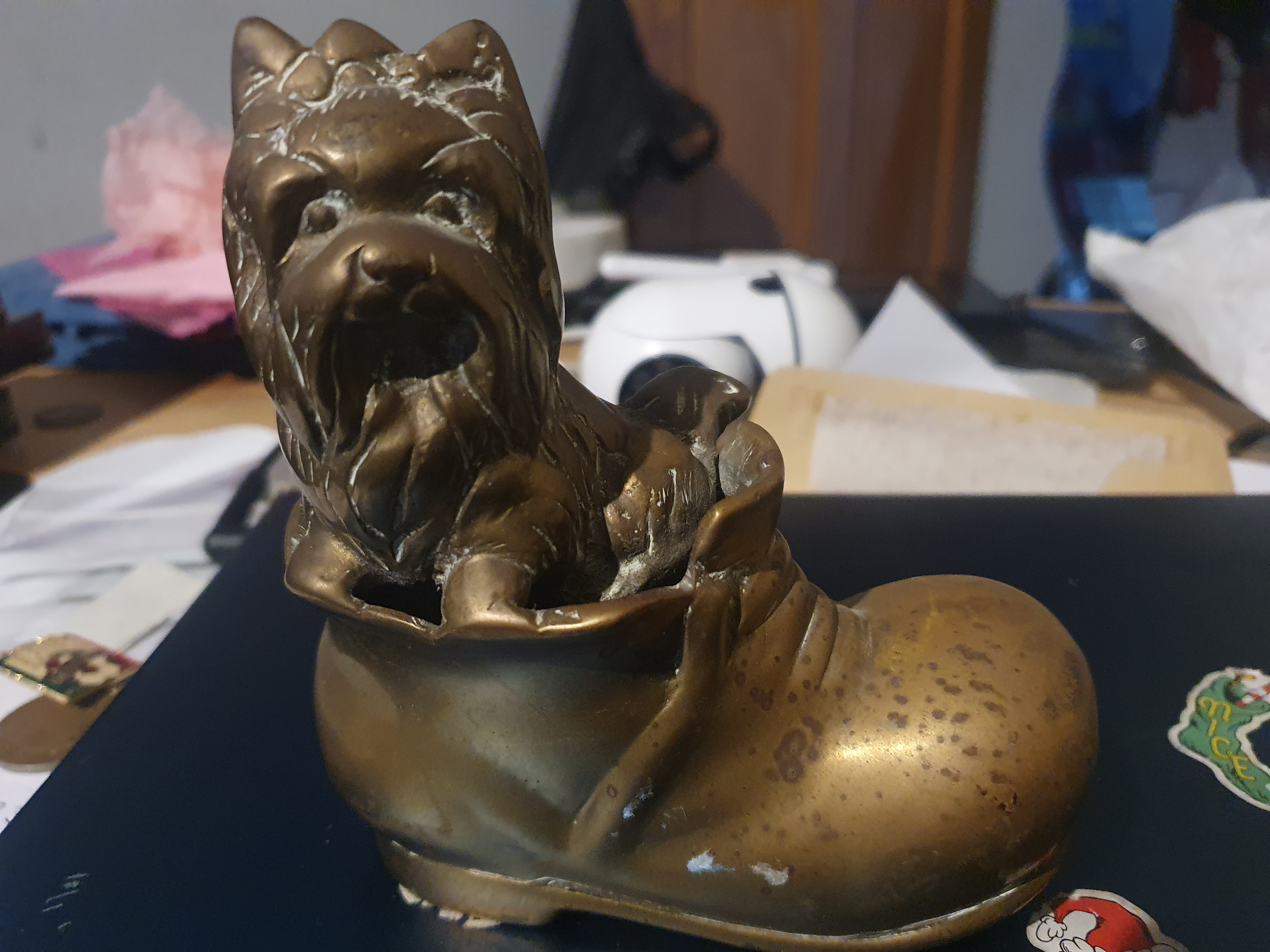 Large brass dog in boot