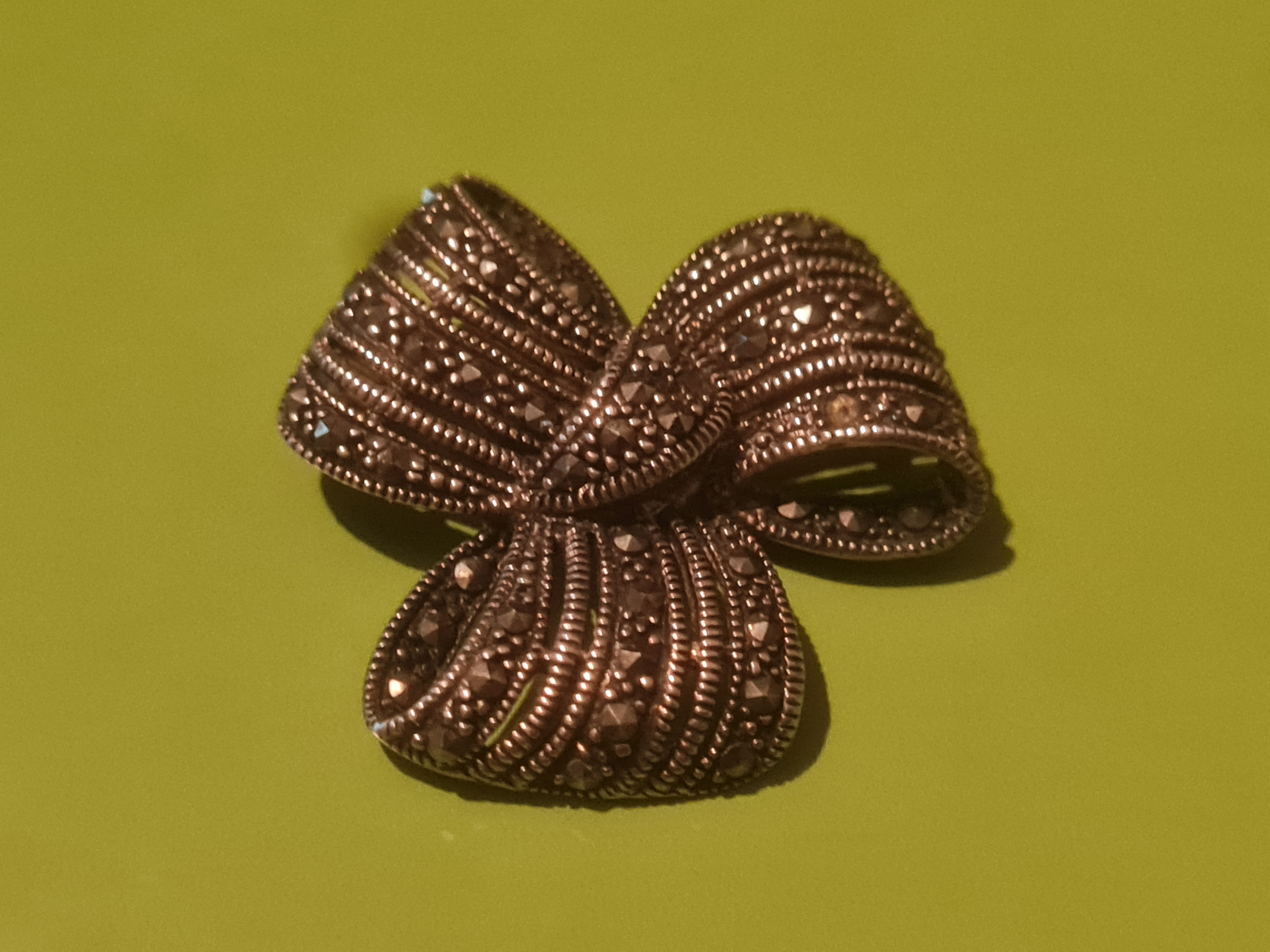Vintage silver stmaped bow design broach with diamonds